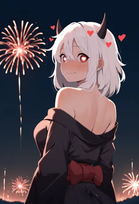 トリガー+外見: mod3us, 悪魔の尾, 中くらいの髪, 白髪, 目の間の髪, 黒い角, 悪魔の角, 赤い目, 心型の瞳