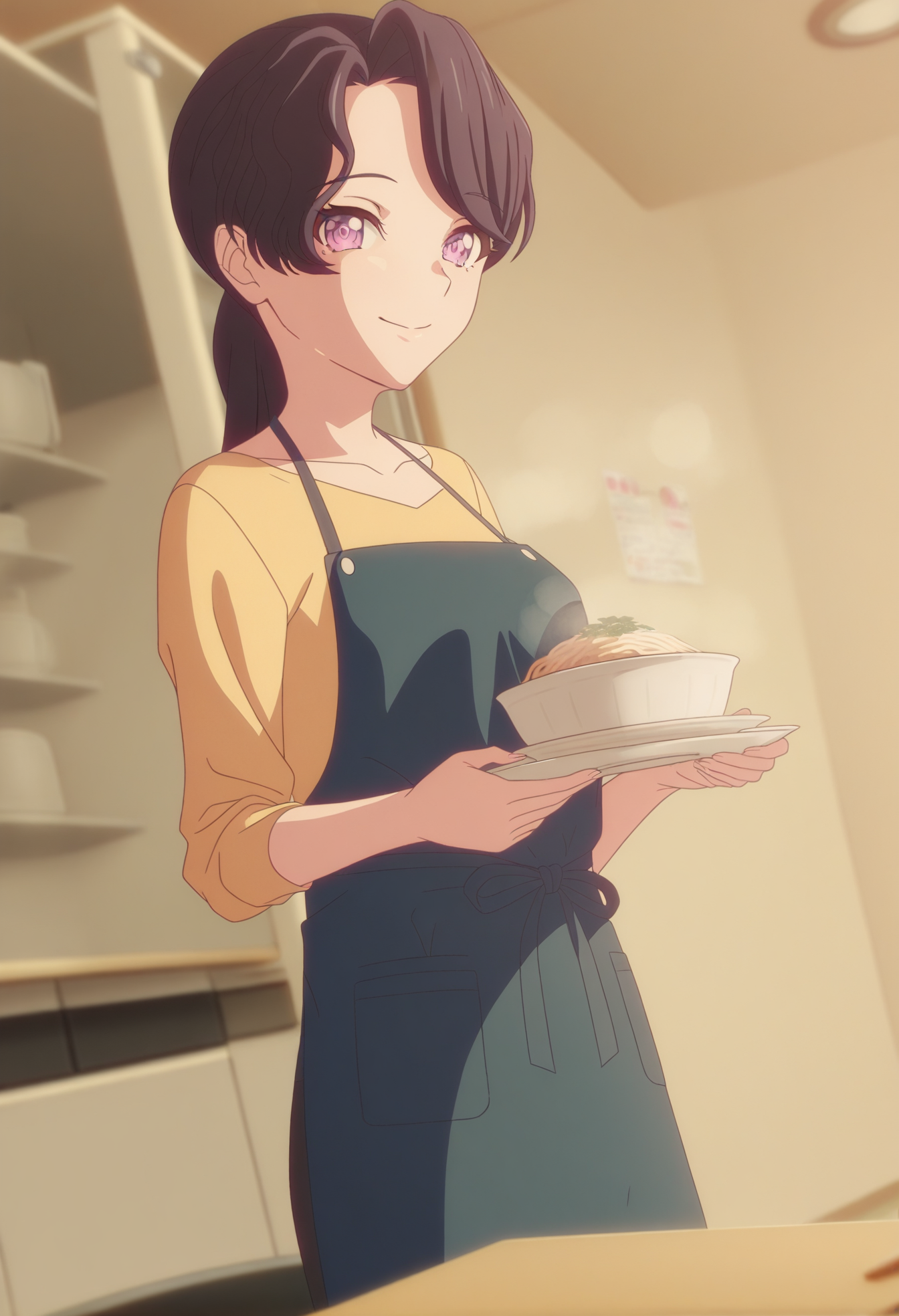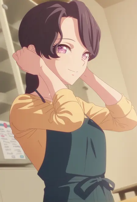 <lora:TSMV1-IL:1>,ponytail,tomori'smom,purple eyes,black hair,long hair,tsm,tsm jewelry,tsm ring,tsm wedding ring,tsm shirt,tsm yellow shirt,tsm apron,tsm blue apron,tsm neck apron,tsm pants,tsm grey pants,tsm socks,tsm low cut socks,tsm grey socks,tsm slippers,tsm blue footwear,