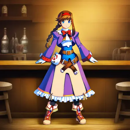 弗吉尼亚: Virgina_WA,棕色头发,发丝蓬松,不对称发型,发辫,单条发辫,刘海,蓝眼睛,红色发带,发带,蝴蝶结,红色蝴蝶结,白色衬衫,衬衫,紫色夹克,夹克,短款夹克,朱丽叶袖,长袖,袖箍,宽袖,手套,白色手套,腰带,长裙,紫色裙子,荷叶边裙,枪套,白色枪套,腰围围裙,皮革围裙,连裤袜,黑色连裤袜,翻边靴,流苏镶边