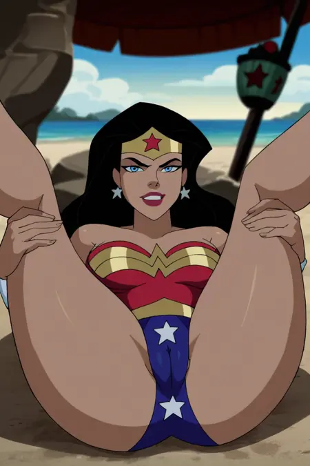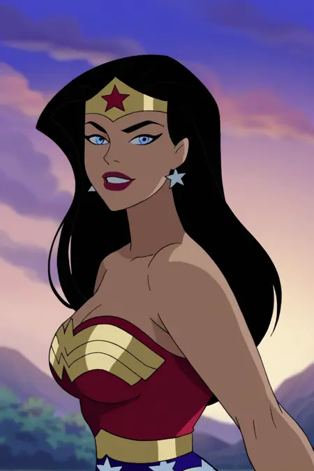 WW: wonder woman, blue eyes, black hair, long hair, red lips, makeup, large breasts, tiara, strapless leotard, star (symbol), wonder woman outfit