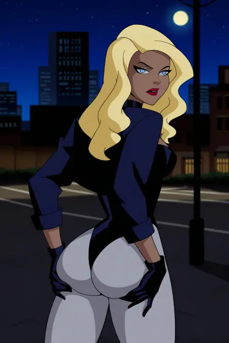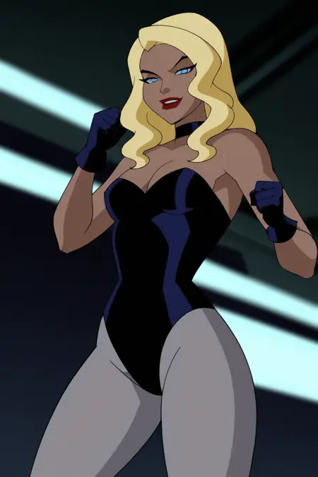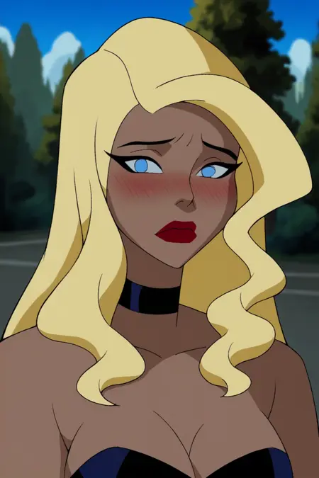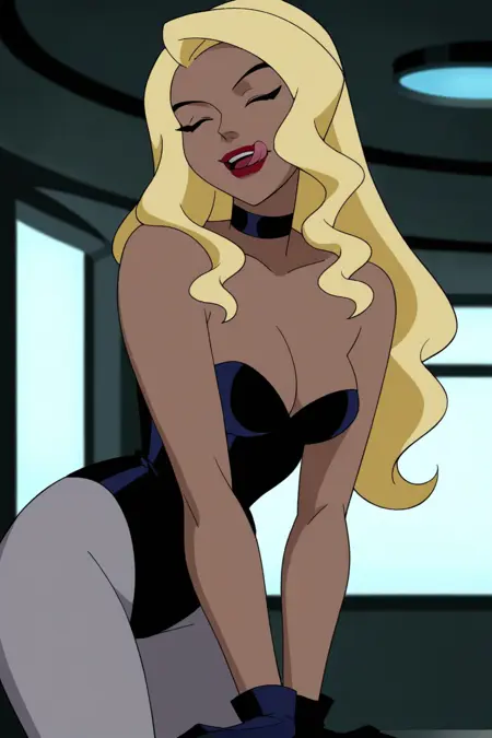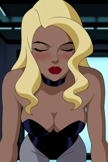 BC: 블랙 캐나리아, 금발, 파란 눈, 립스틱, 붉은 입술, 긴 머리, 메이크업, 중간 크기의 가슴, 검은 피부,