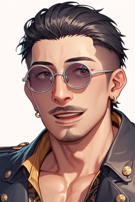 yokohama_outfit, black hair, facial hair, glasses, leather jacket,