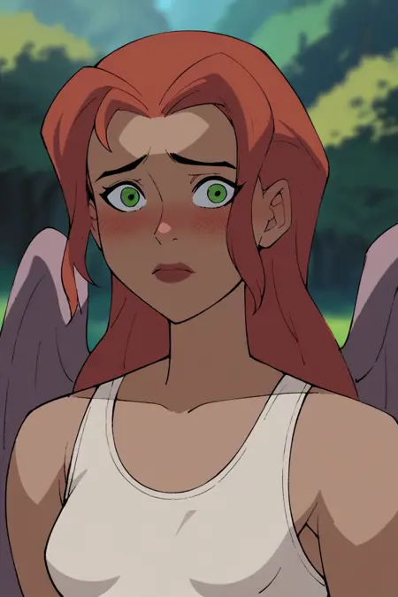 HG: ホークガール。緑の目、赤い髪、長い髪、小さな胸、天使の翼、小さな胸、