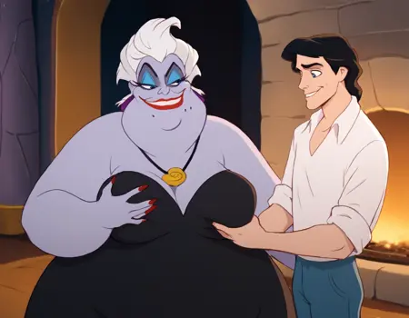 _u_e_를 사용하여 활성화《작은 아가씨》의 바다 마녀 울살라와 에릭 왕자라는 이상한 커플로 이미지를 생성하는 모델.