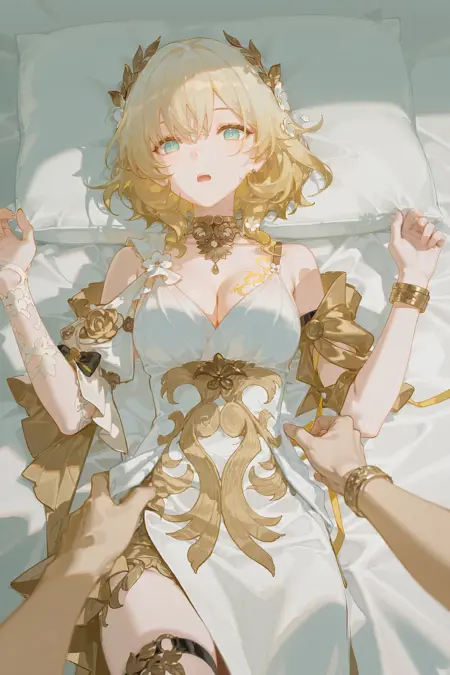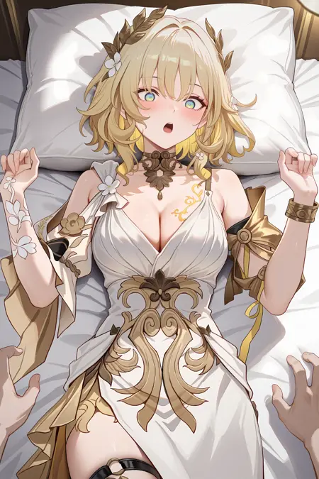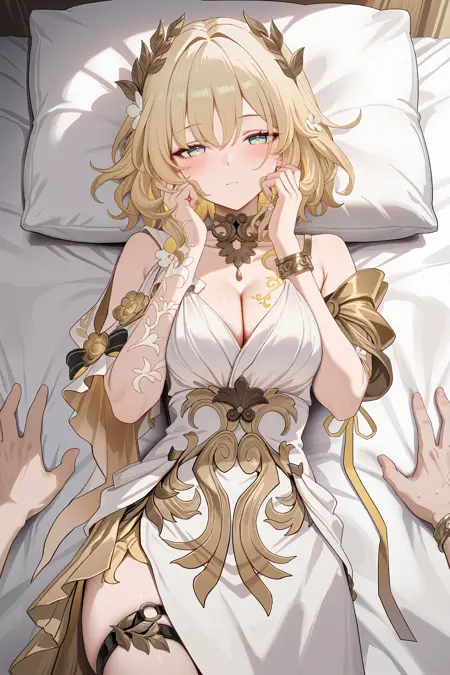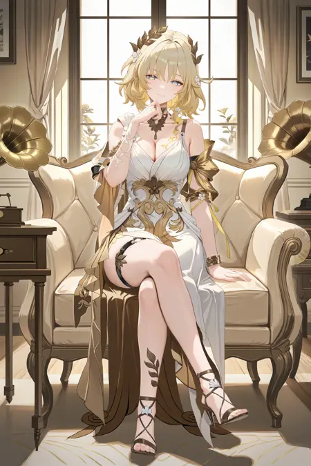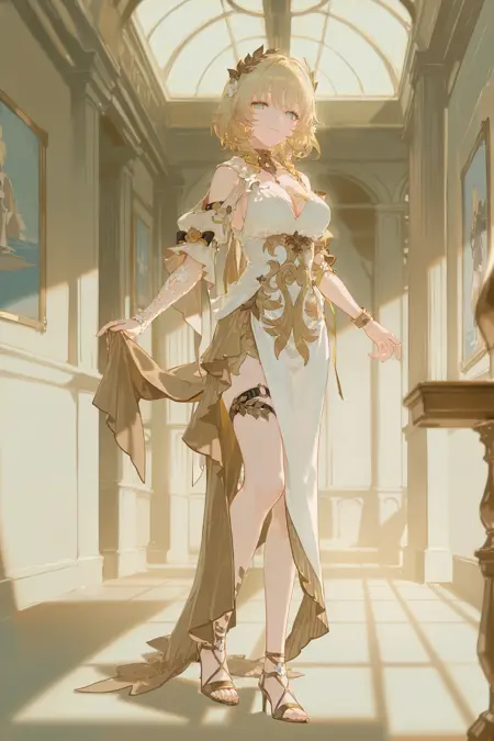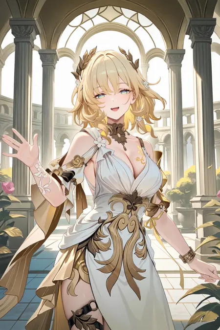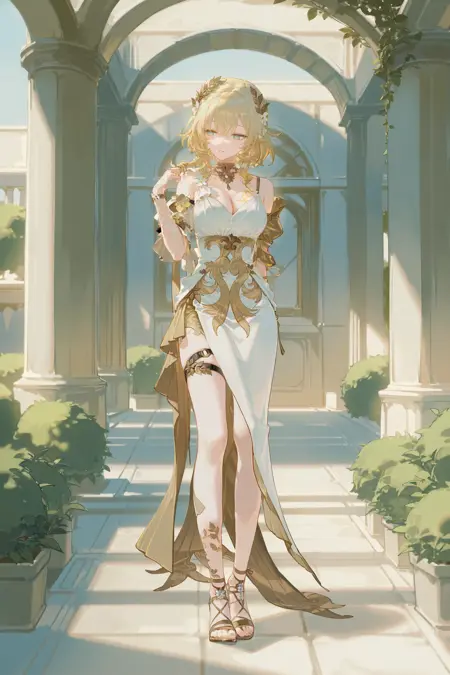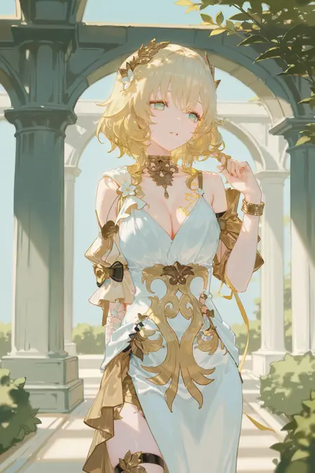 デフォルト衣装の追加プロンプト: 髪の花、月桂冠、胸のタトゥー、ペプロス、太ももストラップ、ブレスレット、分離式袖、片手のレース手袋、ゴールドのチョーカー、グラディエーターサンダル