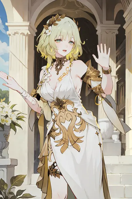 Additional prompts for default costume: hair flower, laurel crown, breast tattoo, peplos, thigh strap, bracelet, detached sleeves, single lace glove, gold choker, gladiator sandals