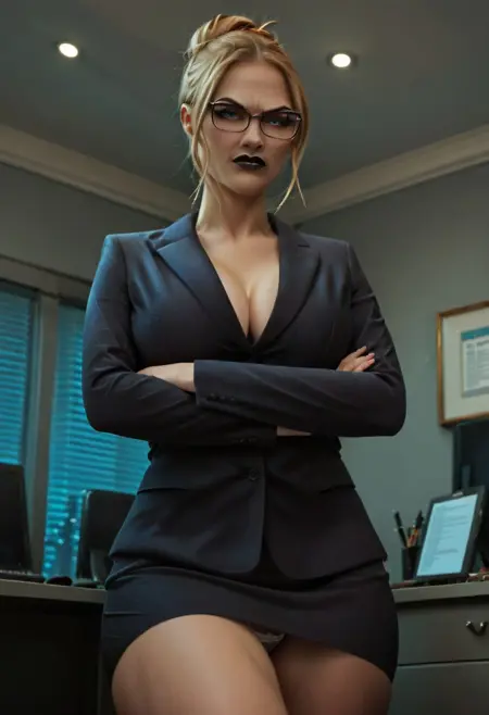 Dark blonde hair, hair bun, annoyed expression, dark-rimmed glasses, dark brown suit, pencil skirt, big breasts