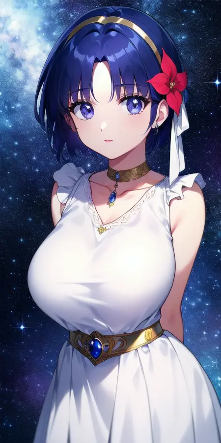 white_high-low_dress_sleeveless_frilled_Straps_gold_belt_neck_ring_hair_flower_hair_ornament_hairband_gem: Her Nihao my concubine OVA dress.