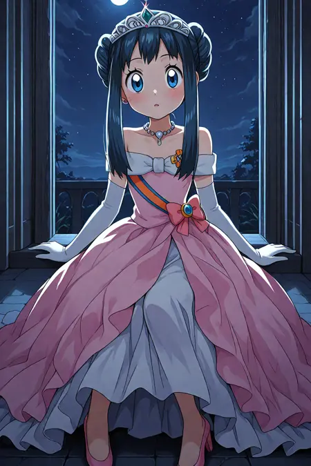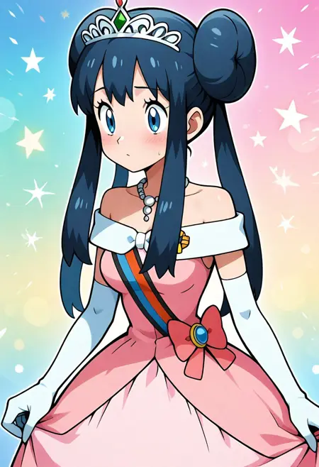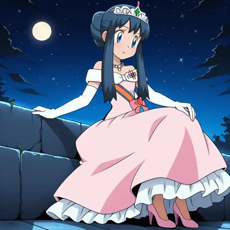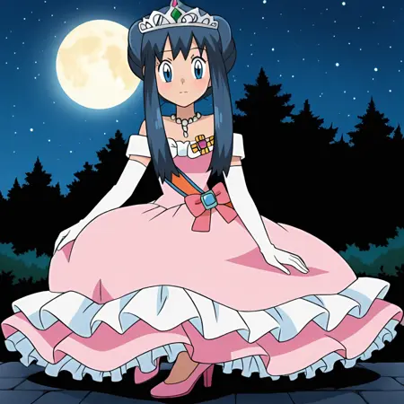 | Trained Words | gfdawn, [dawn_\(pokemon\) blue eyes, dark blue hair, hair bun, sidelocks, pink dress, very long dress, sleeveless, bare shoulders, necklace, jewelry, pin, tiara, pink bow, elbow gloves, white gloves, high heels, shoes, pink footwearCopied! |