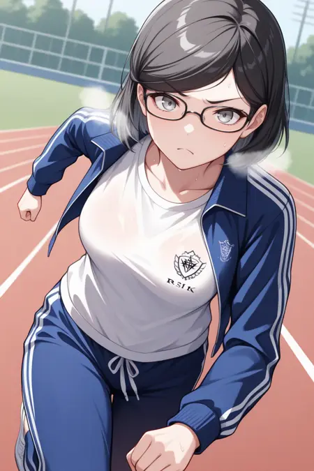 Appearance : r31k0, medium breasts, grey eyes, black hair, short hair, swept bangs, glasses