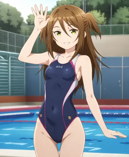 Nikaidou Mari, long hair, two side up, cabbie hat, striped scarf, blue jacket, pleated skirt, thighhighs, knee boots,