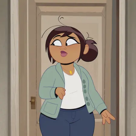 莎伦·麦基(SharonGMMgee,1girl,单独,深色皮肤,棕色头发,发髻,项圈(可能拼写错误),珠宝,项链,夹克,上衣,白色上衣,裤子,蓝色裤子)