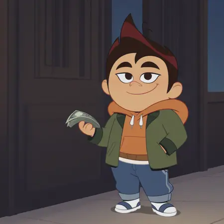 达里尔(DarrylGMM,1boy,棕色头发,浓眉,黑眼睛,绿色夹克,夹克,抽绳,连帽衫,橙色连帽衫,橙色帽兜,帽兜下垂,裤子,蓝色裤子,凉鞋)