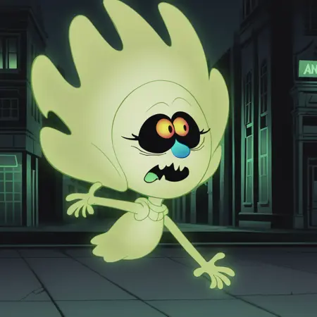 - GhostMMGee, 1girl, ghost, yellow skin, black eyes, pink sclera, pink nose, fangs, purple tongue, green teeth, colored sclera