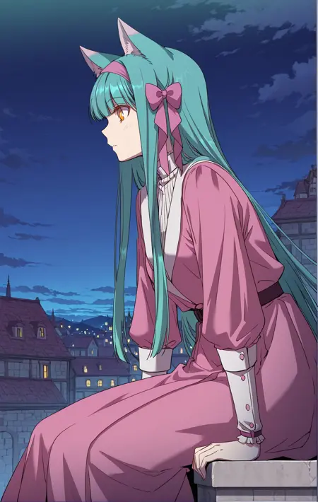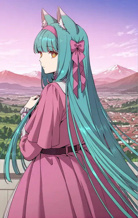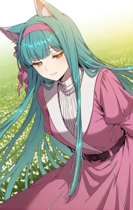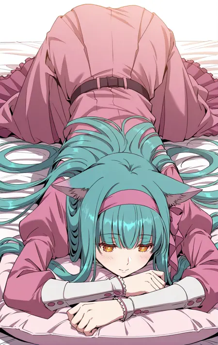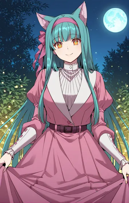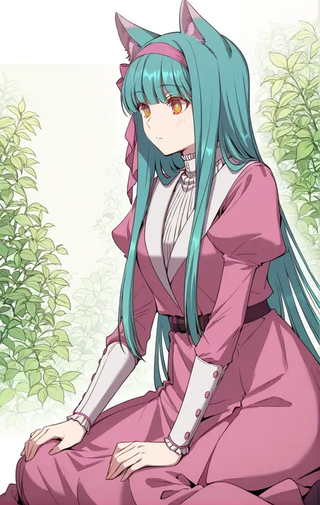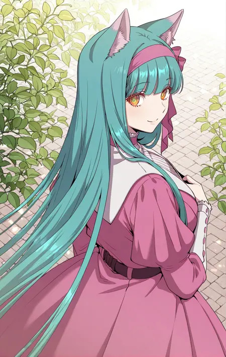 Aeria, 1girl, solo, orange eyes, teal hair, long hair, straight bangs, straight hair, long sidelocks, hair bow, headband, cat ears,