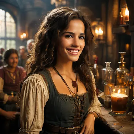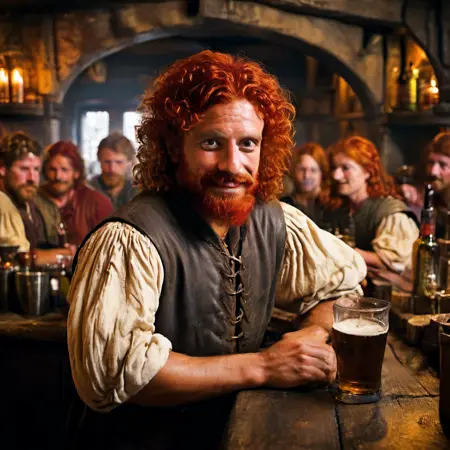 1boy, 1girl, 2boys, 6+boys, alcohol, armor, bald, bar (place), bare shoulders, barkeep, beard, belt, black hair, blonde hair, blue eyes, blurry, blurry background, bottle, bowl, bracelet, braid, breasts, brown eyes, brown hair, candle, cleavage, cooking, cross, crowd, cup, dark skin, dark-skinned male, depth of field, dress, drinking glass, earrings, facial hair, fire, food, freckles, glass, green eyes, grey hair, grin, hair over shoulder, hat, headband, holding, holding cup, jewelry, lips, long hair, looking at viewer, makeup, male focus, meat, medium breasts, messy hair, mole, mole on cheek, multiple boys, multiple girls, mustache, necklace, off shoulder, old, old man, orange hair, own hands together, ponytail, realistic, red hair, scar, shirt, short hair, single braid, sitting, skirt, sleeves rolled up, smile, smoke, solo, solo focus, table, teeth, tongue, tongue out, twin braids, upper body, vest, white shirt
