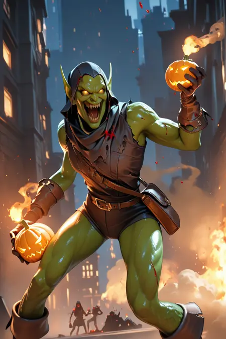 触发词:grngbln、帽子、彩色皮肤、绿色皮肤、绿魔、尖耳朵、兜帽、獠牙、尖牙、围巾、无袖、长袍、上衣、手套、包、短裤、腰带、破旧衣物、靴子