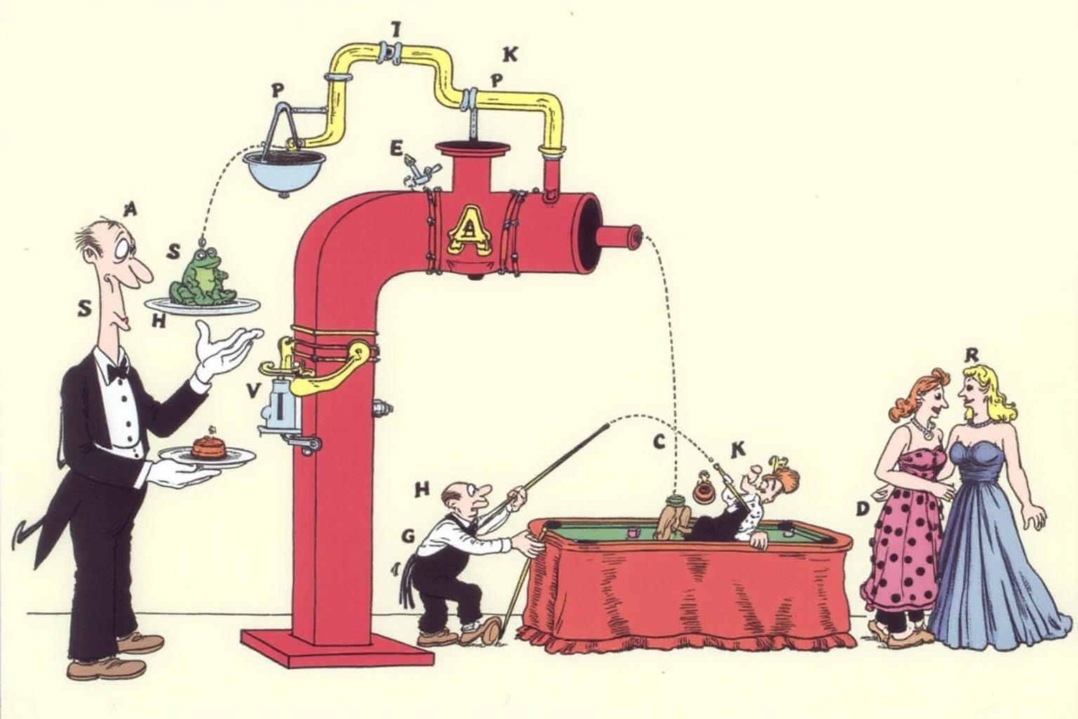 両者は、単純なタスクを非現実的に複雑な方法で実行する、精緻で複雑な装置の描画で有名である。その作品は非常に象徴的で、名前は「無意味に複雑な解決策」の代名詞となった: