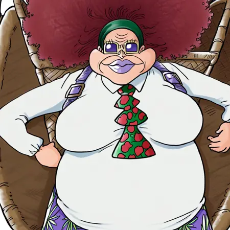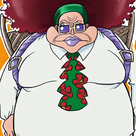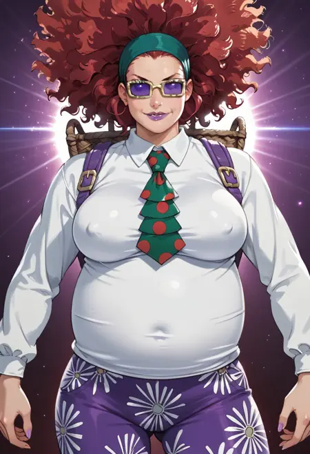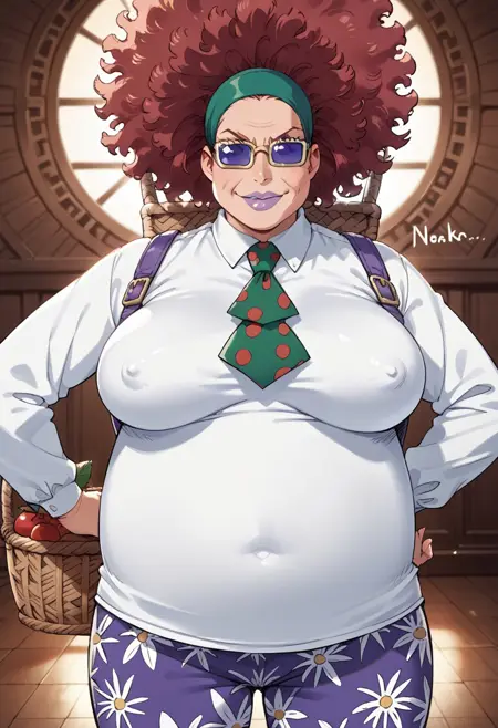 DrophyOP,1个女孩,单独,丰满,长发,红发,卷发,大型紫色镜片太阳镜,紫色嘴唇,牙齿,面部皱纹,大乳房,白色衬衫,长袖,绿色领带,大肚子,宽腰,裤子,裤子上有花卉图案,凉鞋,背后绑着篮子