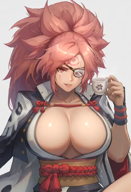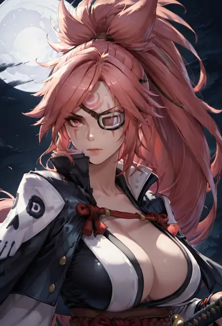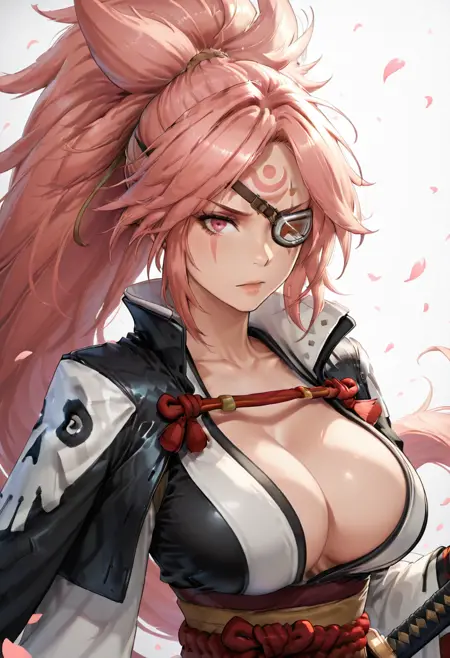 zzBaiken, scar across eye, big hair, long hair, pink hair, ponytail, eyepatch, scar, one-eyed, tattoo, japanese clothes, kimono, scar on face, facial tattoo, large breasts, cleavage, open clothes, open kimono,