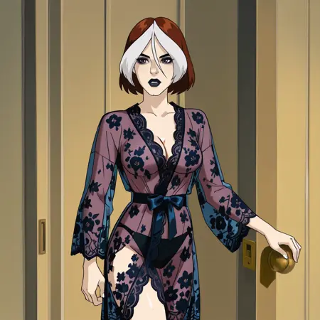 - 복장 포함 트리거: rogueEvolution, 1girl, 다색 머리, 립스틱, 갈색 머리, 바디슈트, 벨트, 메이크업, 흰색 머리, 이톤 헤어, 단발, 가슴, 어깨 패드