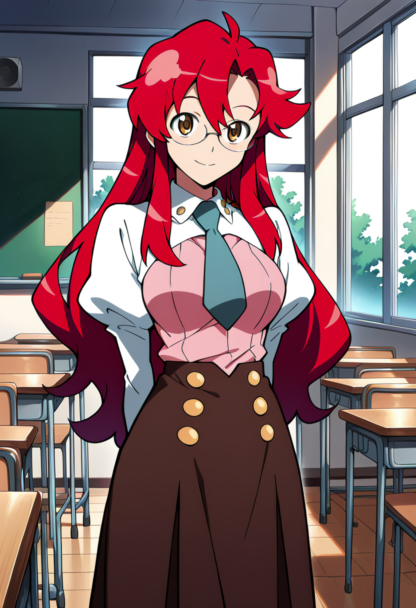 yoko-teacher, 어깨용 옷, 긴 소매, 흰색 소매, 분홍색 셔츠, 선생님, 안경, 안경 쓴, 나이 든, 넥타이, 머리 풀어놓음, 치마, 긴 치마, 갈색 치마, 다른 헤어스타일, 퍼프 소매,