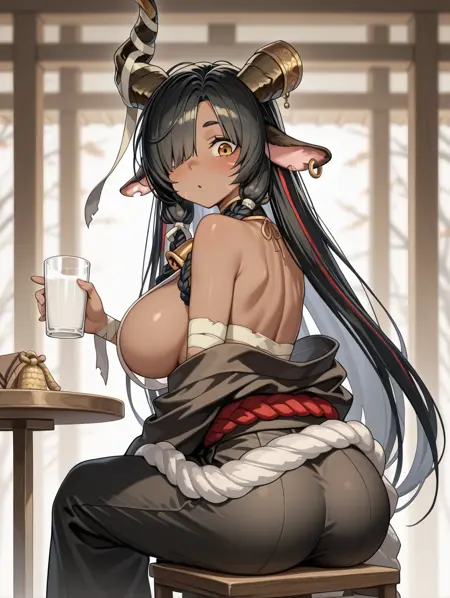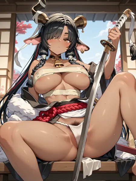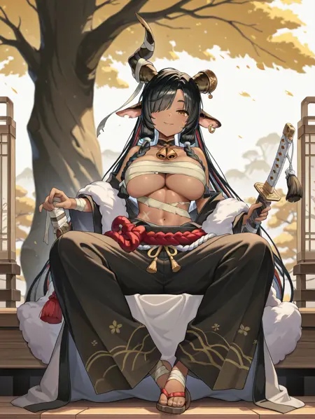 toga, 1girl, solo, long hair, large breasts, black hair, animal ears, jewelry, yellow eyes, earrings, japanese clothes, horns, dark skin, hair over one eye, dark-skinned female, bell, bandages, black pants, side braid, neck bell, cow ears, horn ornament, cow horns,