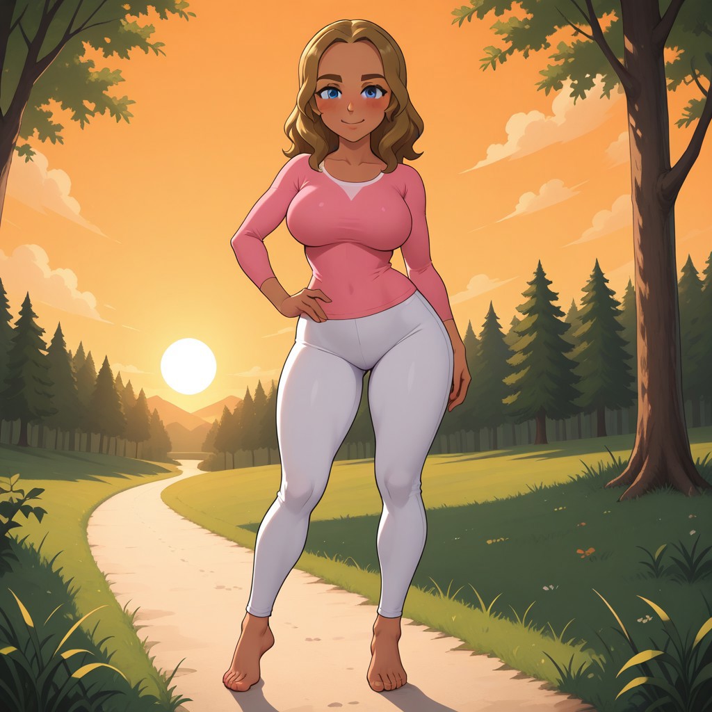 wii, mii, wii sports, 1girl, cute, female mii, dark skin, dark skin female, dark blonde hair, blue eyes, brown eyebrows, blush, pink clothing, white pants, shoes, BarbaraWSC, breasts, nintendo mii, modern_mii, classic_mii