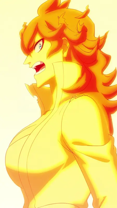 h3llfire inc4rnate, f1re hair, short hair, f1re jacket, f1re tube top, no pupils, f1re sash, f1re pants, f1re ankle boots, breasts, large breasts, cleavage, torn clothes,