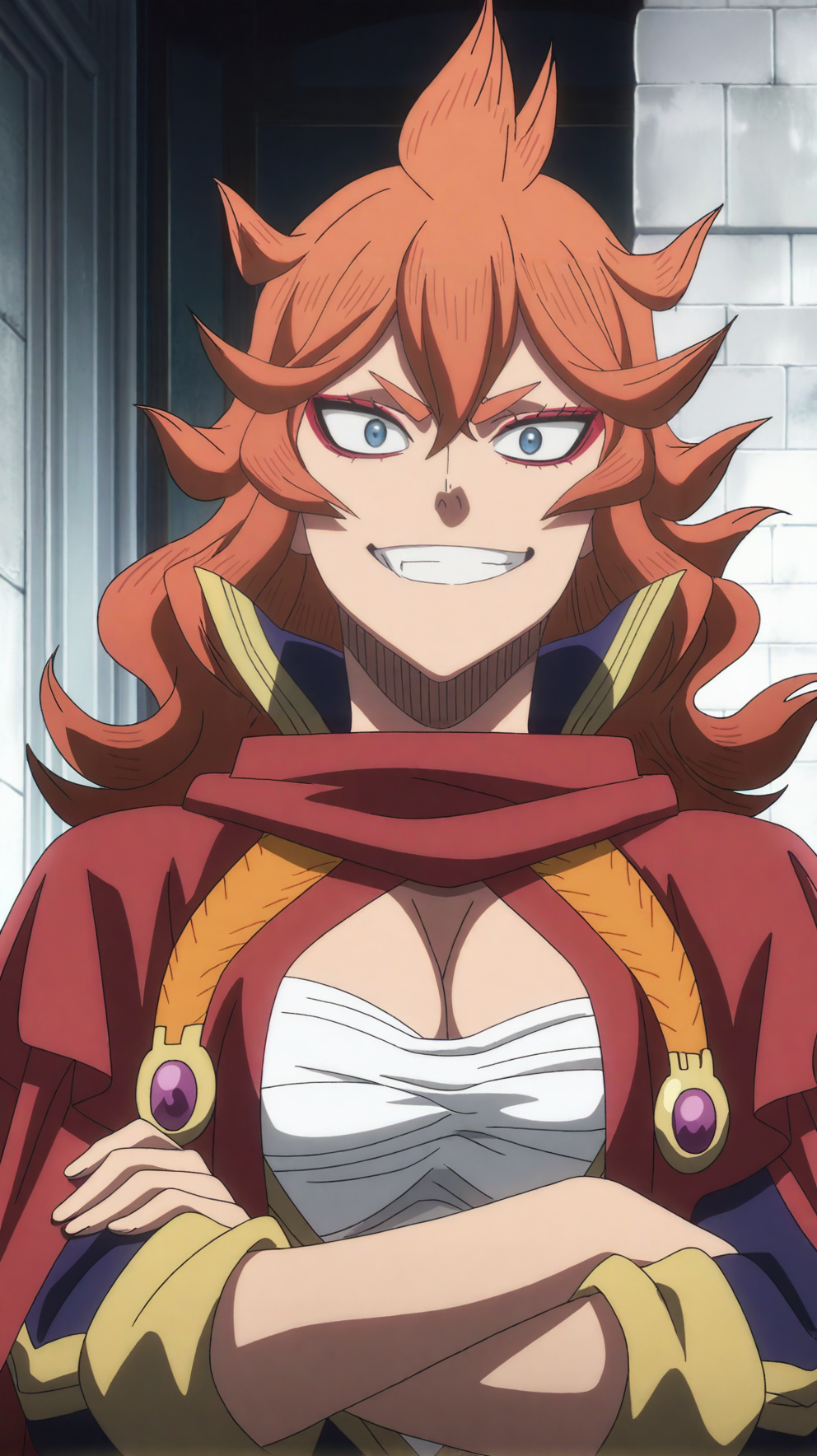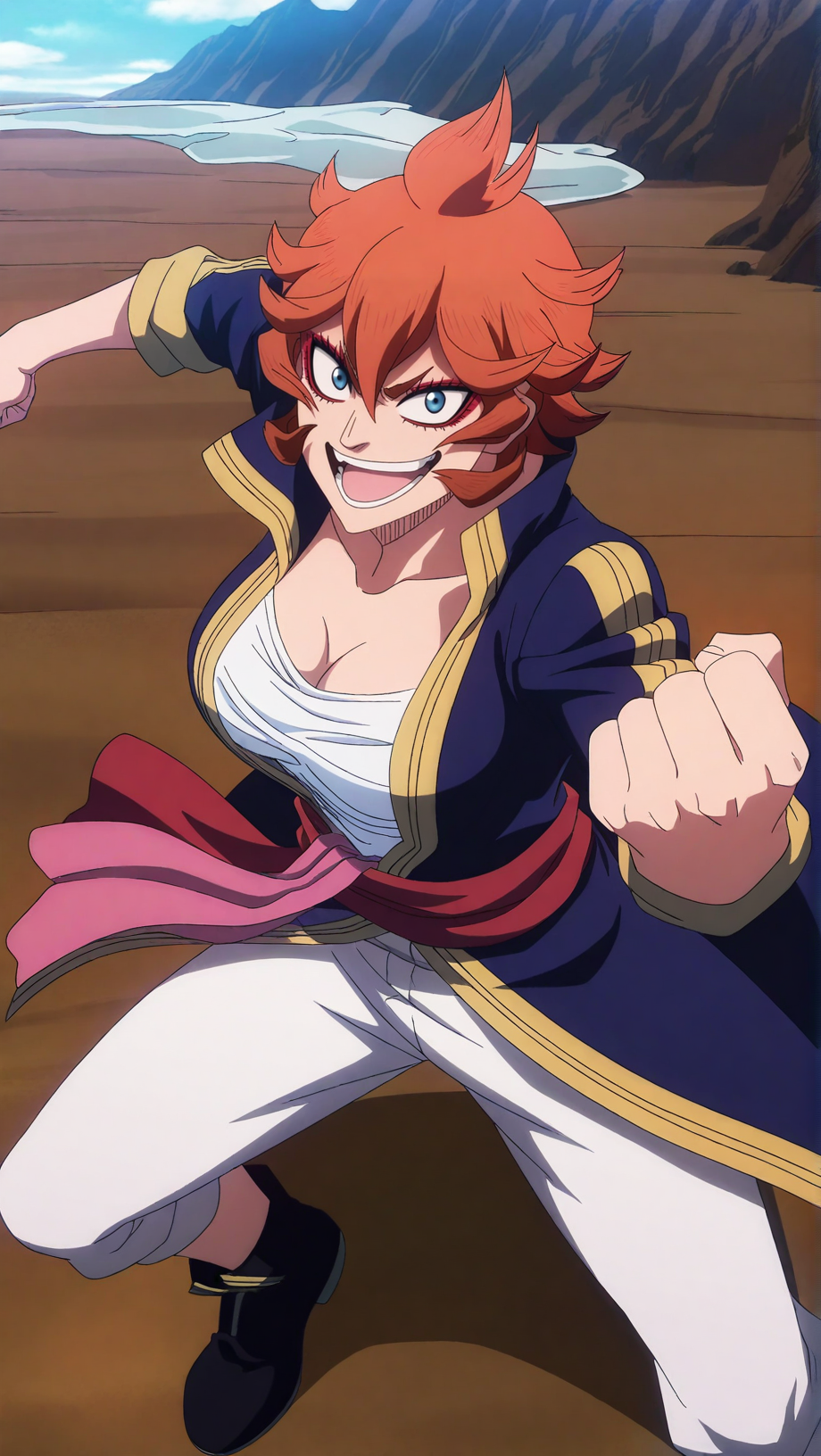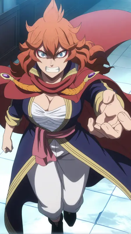 mereoleona vermillion, orange hair, blue eyes, hair between eyes,
