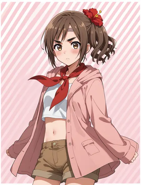 white shirt, hair flower, bandaid on forehead, pink jacket, brown shorts, red scarf