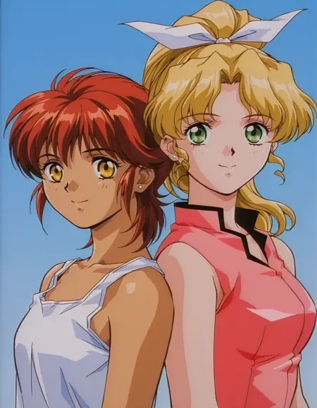 kei, ponytail, sleeveless, red shirt, blue skirtkei, ponytail, strapless leotard, blue leotard, white skirt, wrist cuffs, detached collar