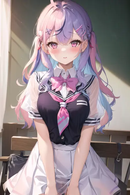 nieniezi girl,1girl,pink eye,purple eye,demon tail,ahoge,demon wings,hair ornament,horns,split-color purple hair and pink hair,hairclip,hat,white background,black bodysuit,purple bodysuit,purple coat