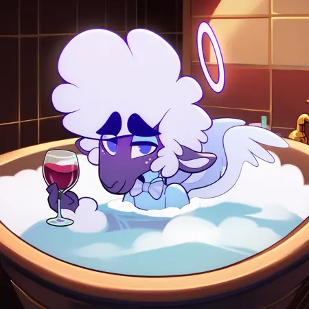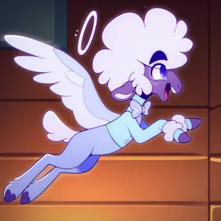 Suggested tags: 1boy, bowtie, halo, angel wings, eyes visible through hair, detached eyebrows, heart-shaped hooves, buttons,