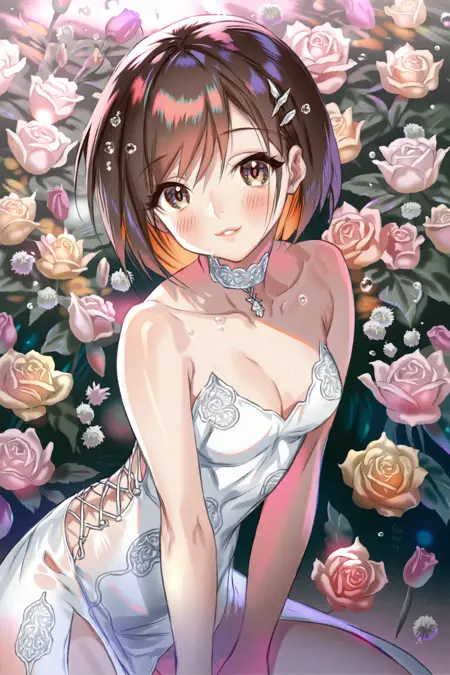 角色触发词通常不会携带角色本身的着装特征,若要添加角色着装,则需要在提示词中添加衣物名。例如,游戏《碧蓝航线》中角色圣路易斯 ( st. louis \(luxurious wheels\) \(azur lane\) ) 的衣装触发可使用 silver evening gown, plunging neckline。类似地,您也能对任何角色添加其他角色的衣装标签。