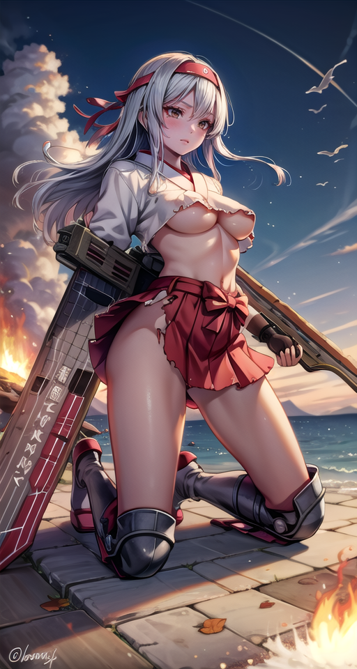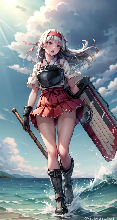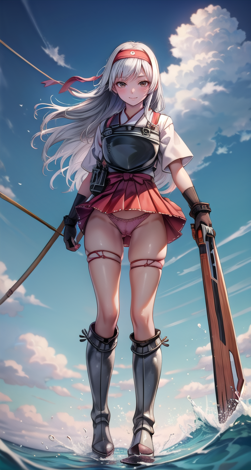 和服、袴スカート、胸板、手拭い、飛行甲板、片手袋、赤い袴、巫女、手袋、ロングブーツ、弓手、太ももブーツ、悠斗、笑顔、白い着物、黒いレッグウェア、黒いブーツ、絶対領域、