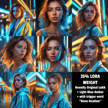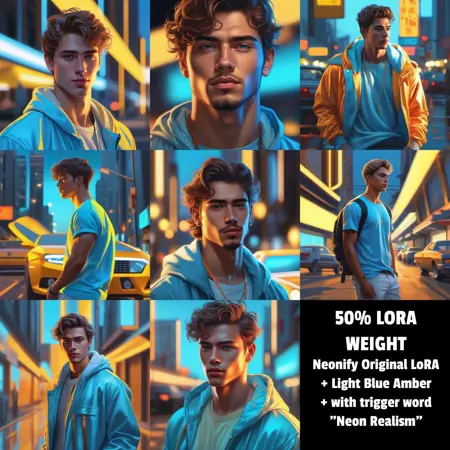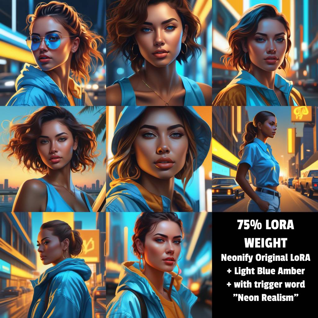 示例提示词:lora:Neonify:0.50, neon realism, (light blue and light amber)