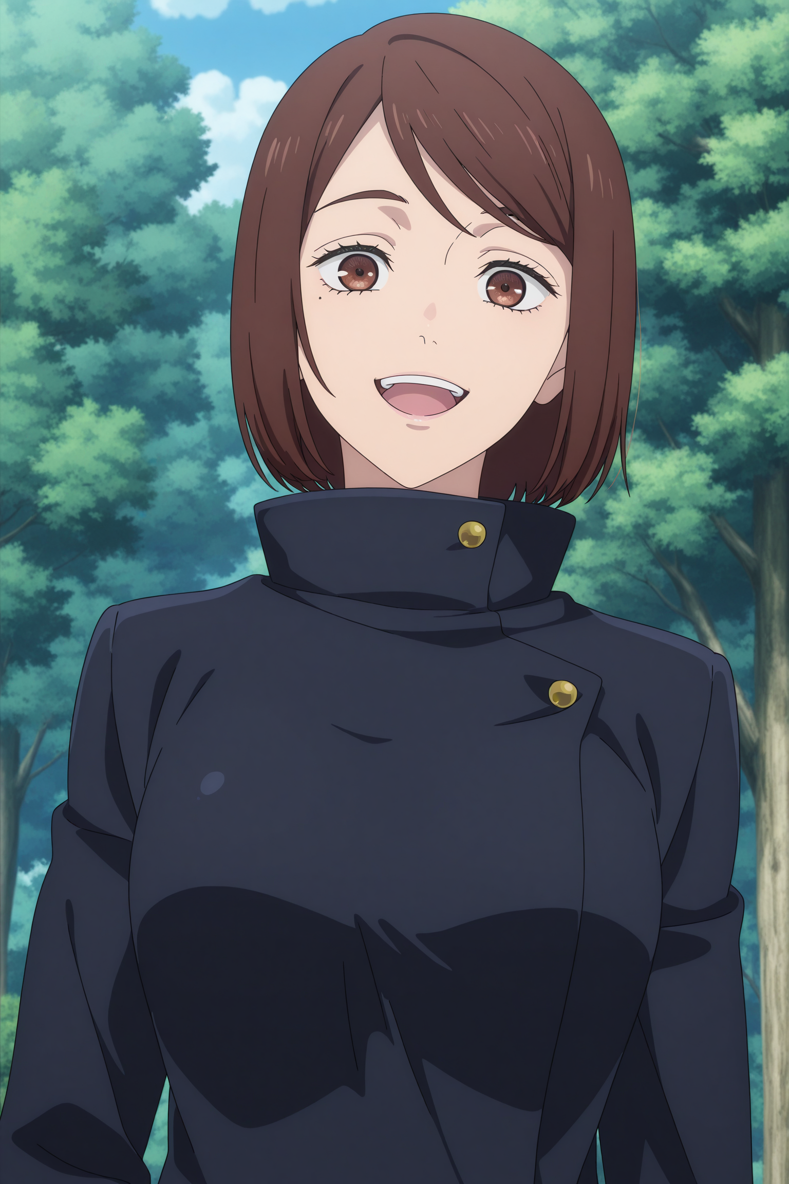ieiri shoko (과거), 짧은 머리, 갈색 머리, 갈색 눈, 눈 밑 점, 긴 소매, 주주쓰 기술학교 유니폼, 검정 재킷, 높은 칼라, 검정 치마, 펜실 치마, 회색 팬티스타킹, 갈색 신발, 로퍼