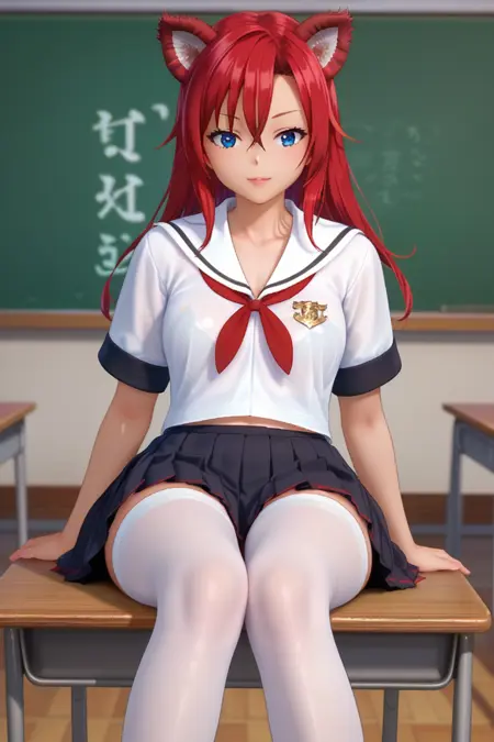 校服:蓝眼睛,红发,动物耳朵,发丝间杂,尾巴,水手服,百褶裙,短袖,紧身长袜,鞋子