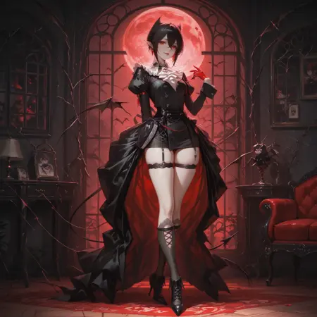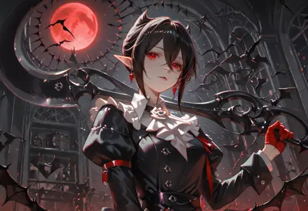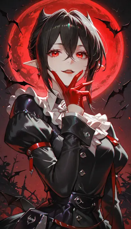外观:红眼睛,黑色星形瞳孔,尖耳朵,黑发,短发,吸血鬼,