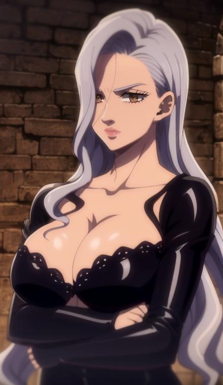 1girl, solo, long hair, brown eyes, grey hair, anime coloring, cleavage