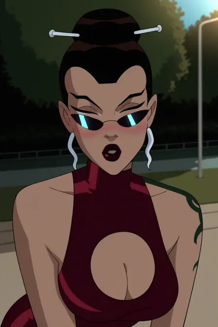 룰렛: 룰렛, 갈색 머리, 파란 눈, 단일 머리 뭉치, 머리 꽂이, 붉은 입술, 검은 피부, 큰 가슴, 문신, 선글라스, 귀걸이, 붉은 드레스, 가슴 노출