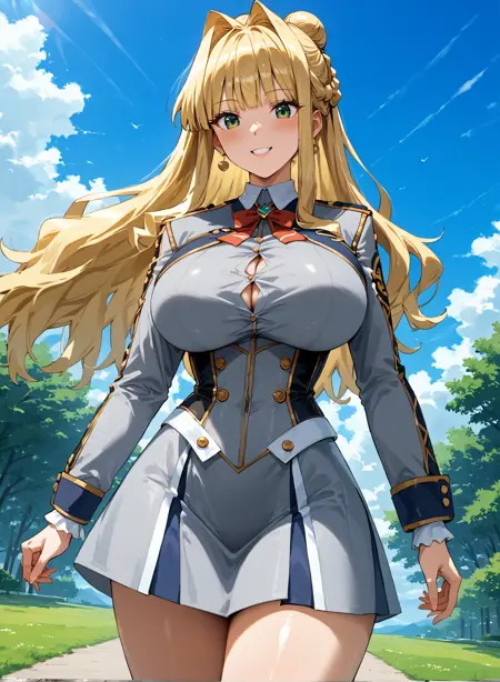 デフォルト:vivienne ootori、金髪、一つ結び、長髪、髪の流れ、緑の目、ユニフォーム、スカート