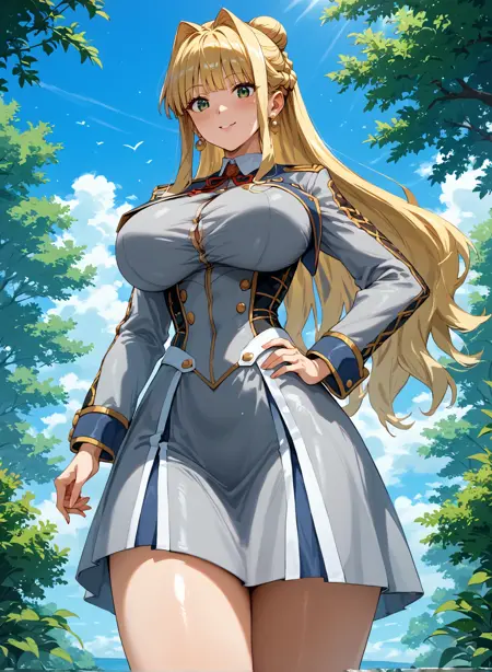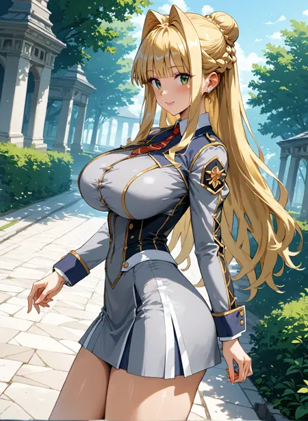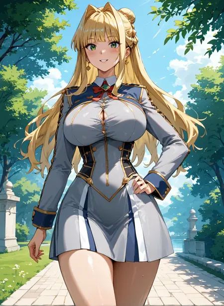 默认:vivienne ootori、金色头发、单马尾、长发、发丝内收、绿色眼睛、制服、裙子