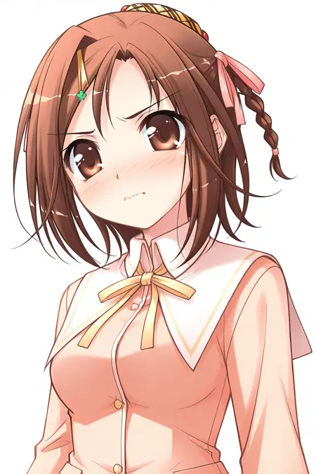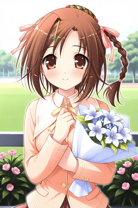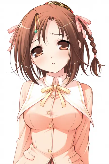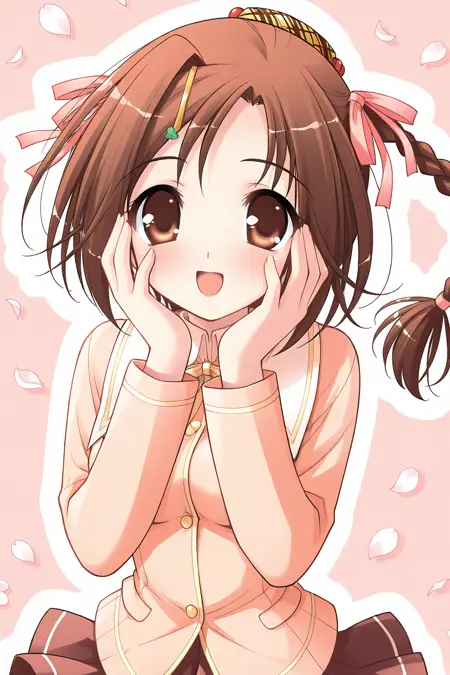 kamisaka haruhi,brown eyes,brown hair,short hair,hair intakes,ponytail,single braid,side braid,hair ribbon,pink ribbon,hairclip,clover hair ornament,