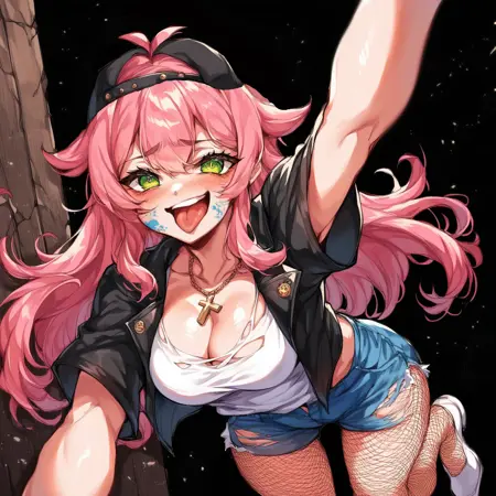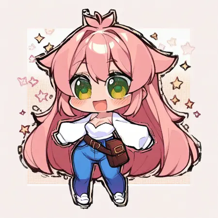 Celestium, 单人, 粉色头发, 绿色眼睛, 天线发, 超长发, 发帘, 刘海, 蓝色裤子, 白色衬衫, 腰带, 皮包, 蓬松袖子, 朱丽叶袖, 胸部显露, 长袖, 白色鞋履, 油漆溅痕, 脸上油漆溅痕, 锁骨, 粉色指甲,