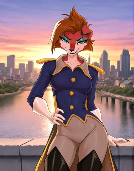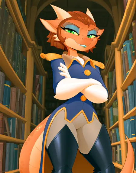 The only other real important tags are uniform, green eyes, and female. There's also a couple tags for her boots. Putting in just thigh boots works mostly for images from the thigh up. use the full high heeled thigh boots for a more full shot of her standing. Of course you can use other species and clothing tags if you want.
