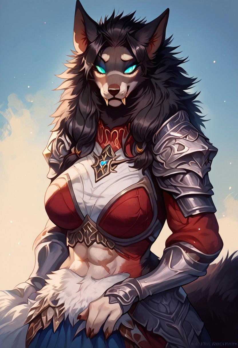 1girl, Lakaiger, worgen, werewolf, furry, long hair, black hair, white body, black fur, two-tone fur, blue eyes, glowing eyes, detailed eyes, big ears, animal ears, pointy ears, snout, claws, scars