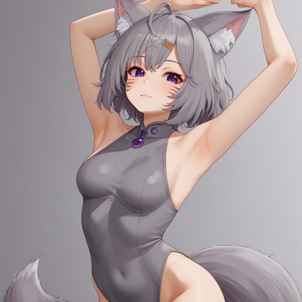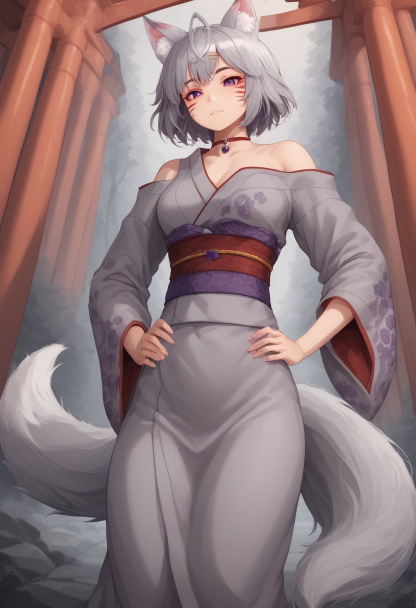 FlipsieVT, 1girl, フォックスガール, 動物の耳, バーチャルユーチューバー, 狐の尾, 動物の耳のふわふわ, 動物の耳, 狐の耳, 短い髪, 灰色の髪, 紫の目, 髪の飾り, 顔のマーク, 和服, 着物, 帯, 鳥居,