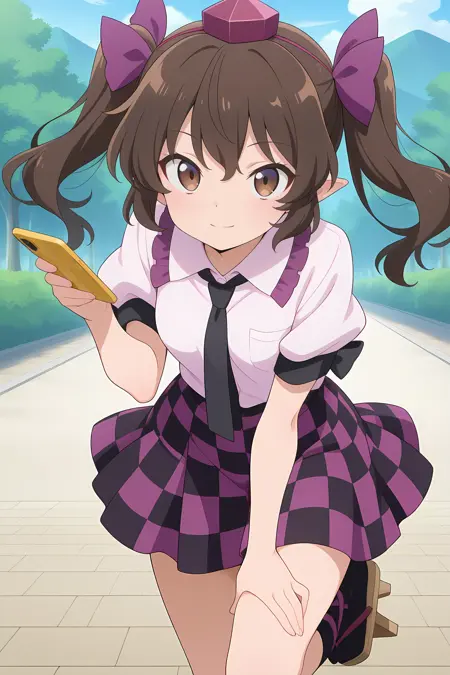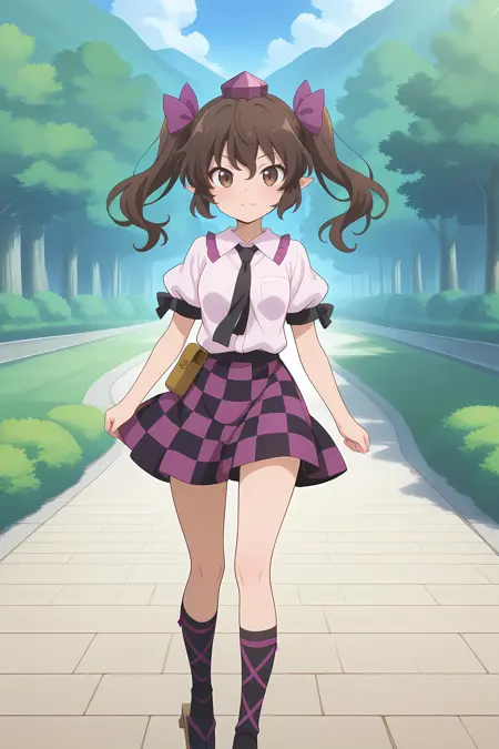 purple hat, tokin hat, hair ribbon, purple ribbon, black necktie, white shirt, collared shirt, frilled shirt collar, puffy short sleeves, pouch, multicolored skirt, black skirt, purple skirt, checkered skirt, plaid skirt, miniskirt, kneehighs, black socks, tengu-geta,